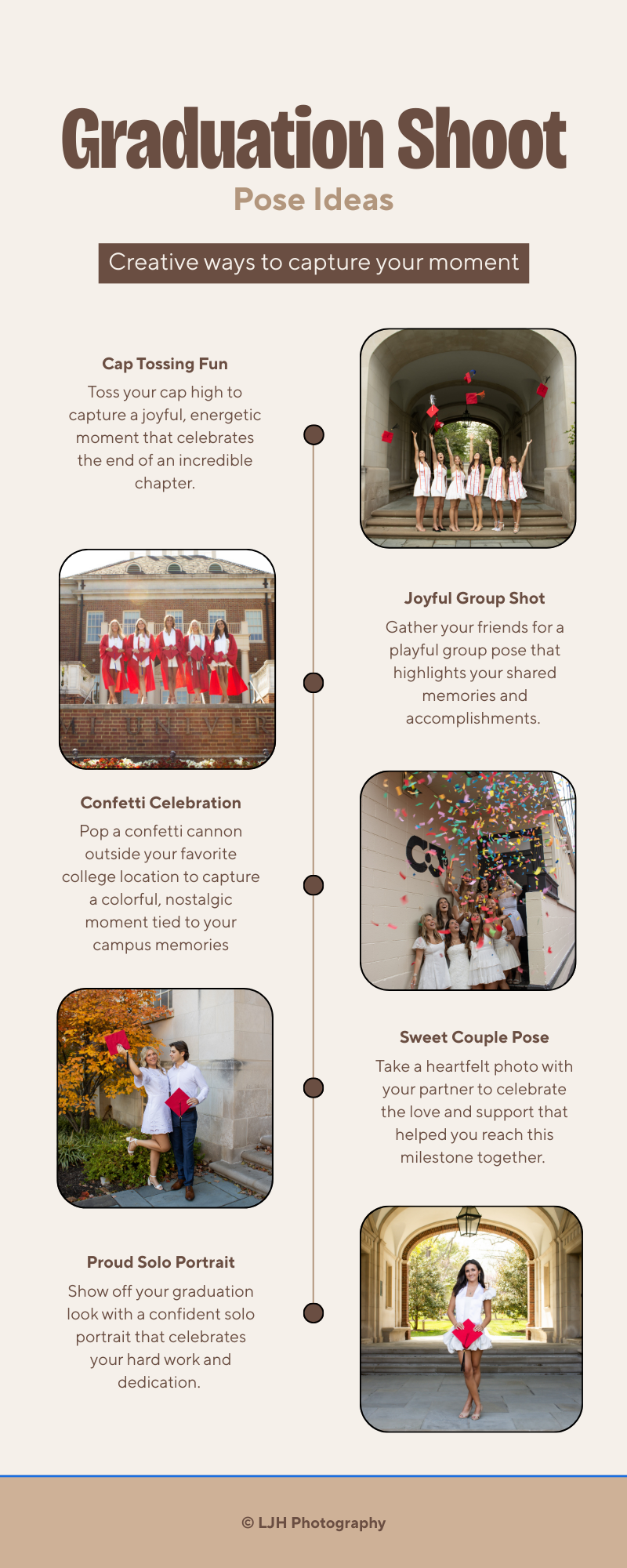 Graduation isn’t just about the cap and gown—it’s about the journey, the friendships, the places that shaped you, and the little moments you’ll want to look back on years from now. The infographic showcases graduation shoot poses that capture exactly that: the personality, excitement, and emotion behind this transition.